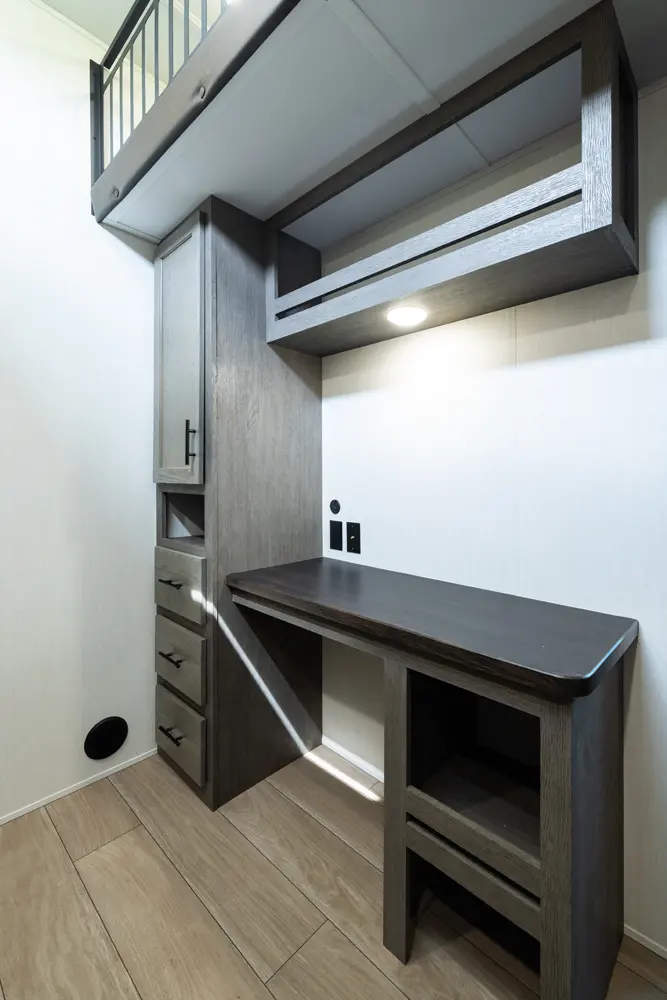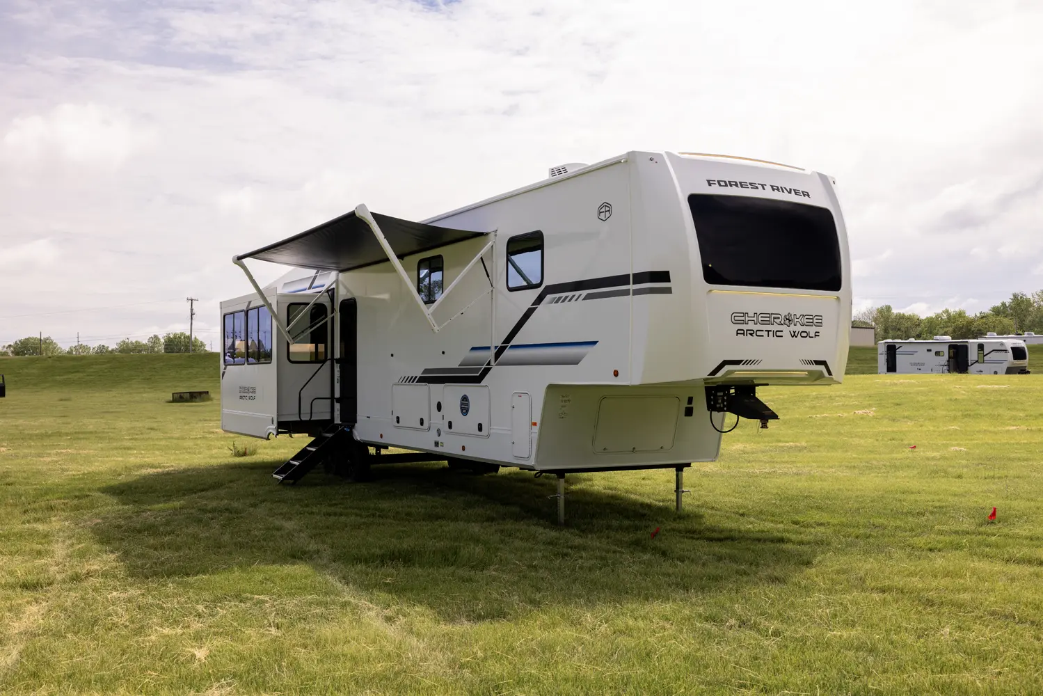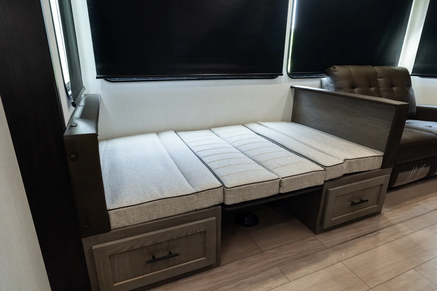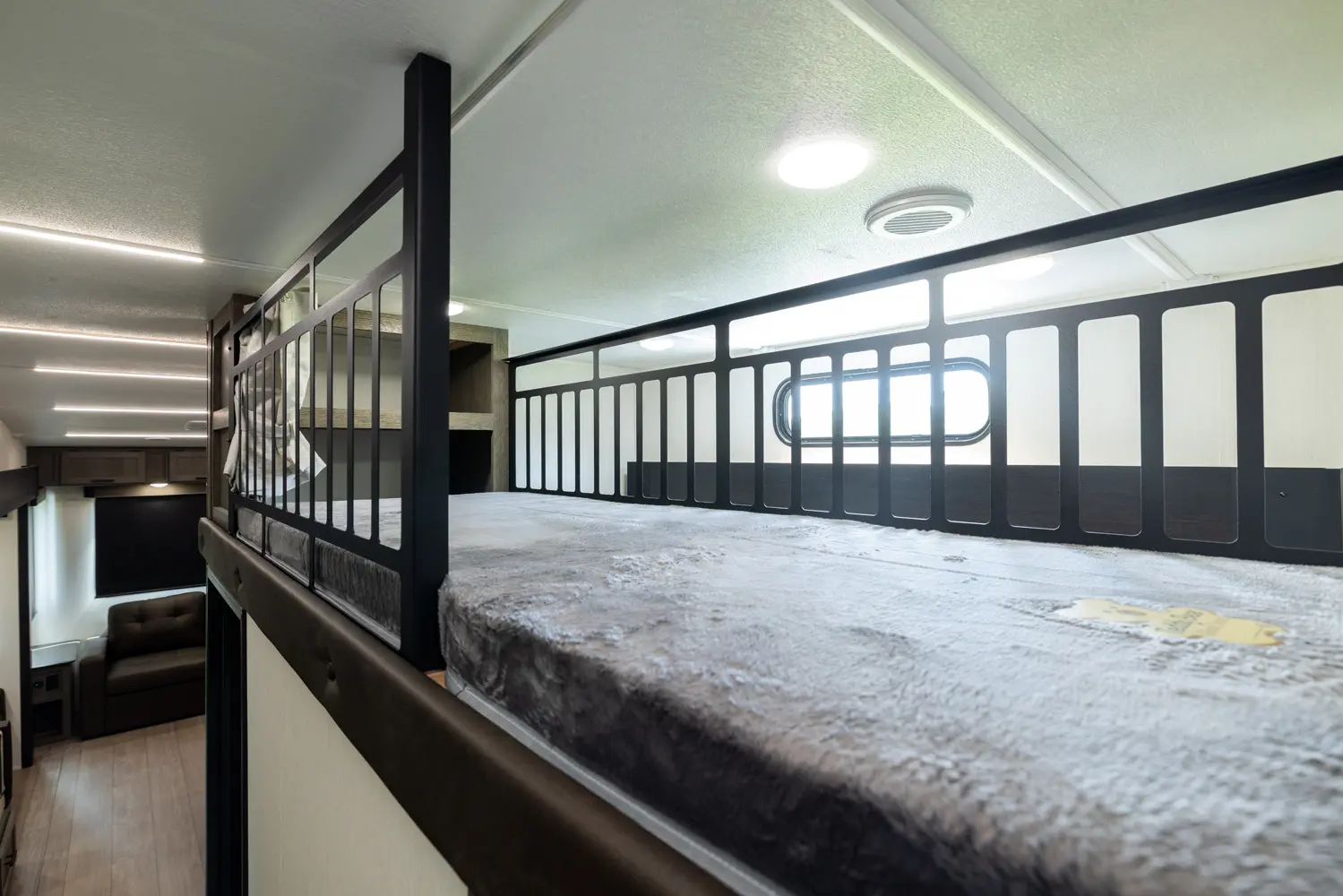 Versatility is the name of the game with the Arctic Wolf 3650SUITE by Forest River. The bonus room located in the middle of this model is highlighted by a desk, trundle bed, drop down bunk, jack knife sofa and a loft overhead. The living room is flanked by big windows for natural light and the entertainment center doubles as a large hidden pantry. For extra sleeping, both the trifold sofa and dinette convert into extra beds when not in use. Up front you'll find a king bed and full bathroom.