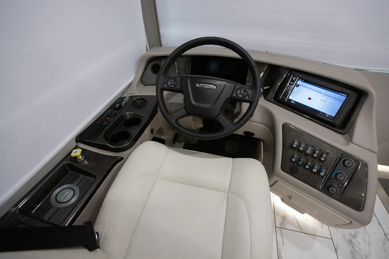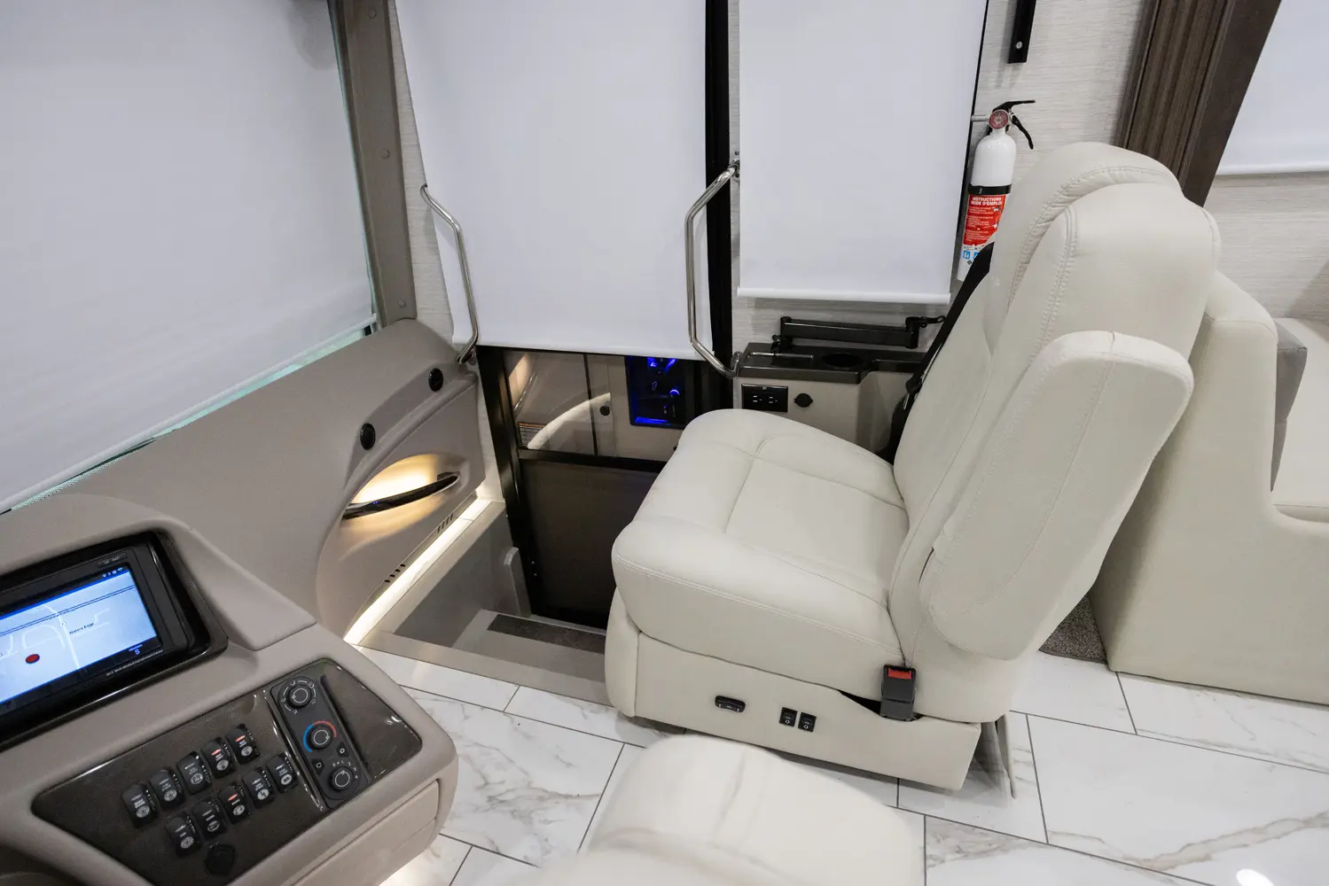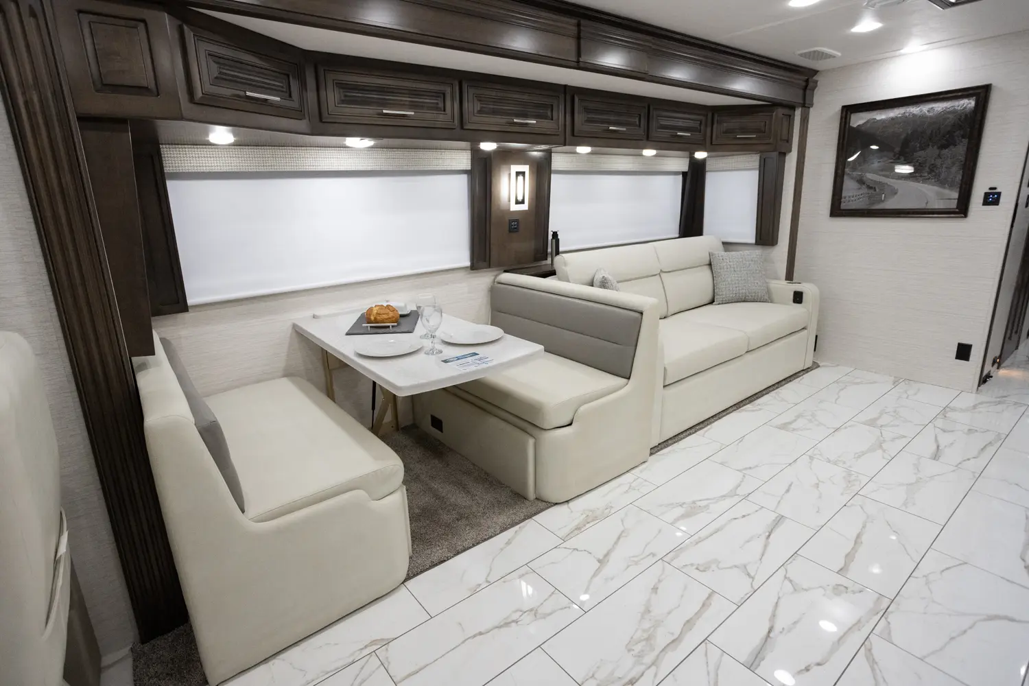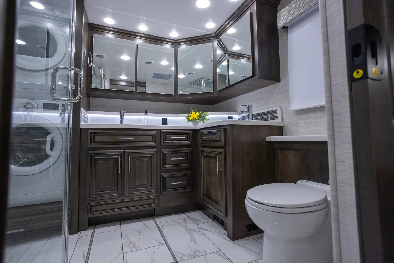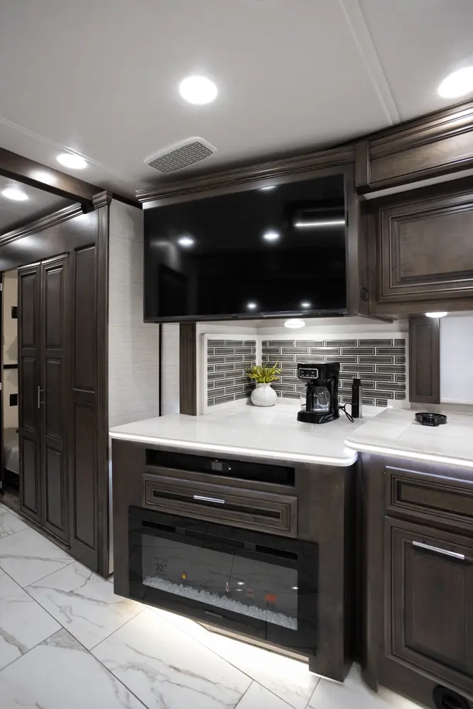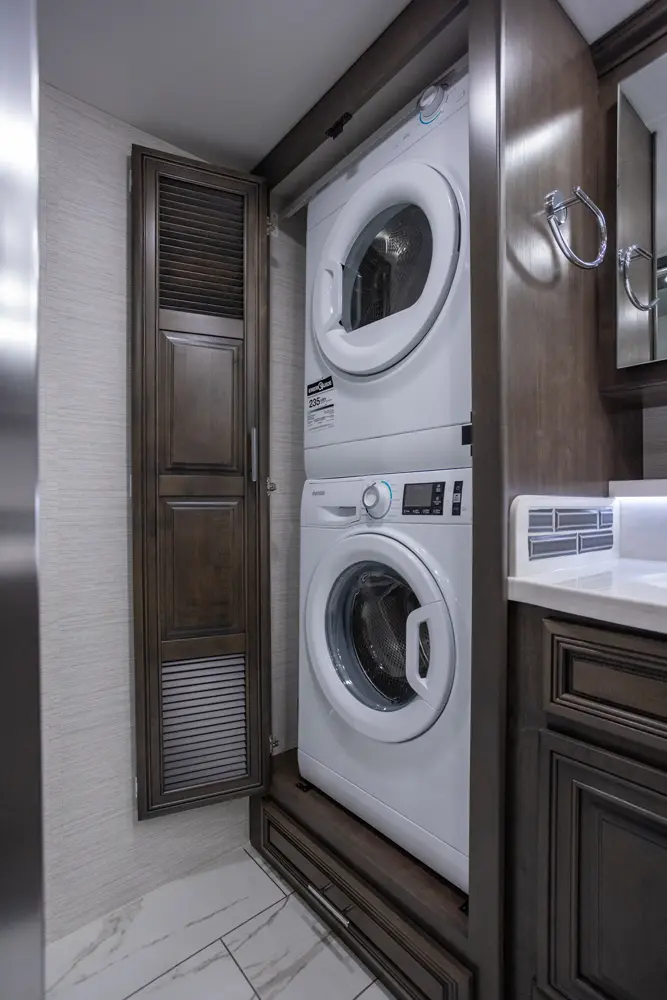 The Berkshire XLT 45A is a four-slide bunkhouse model with two full bathrooms. The rear large full bath includes a shower, vanity with dual sinks, overhead cabinets, and stacking washer/dryer. The main bedroom has a slideout, 72" x 80" Tilt-a-View king bed, plus a dresser, wardrobe cabinet, 43" TV, and overhead cupboards. The second full bath has a shower, vanity sink, medicine cabinet, and commode. Across across from this bathroom is the bunk room/wardrobe combo. The kitchen provides a convection microwave, induction cooktop, and residential-style refrigerator. Just over the cockpit, you'll find a unique drop-down bed that provides an additional sleeping surface at night.