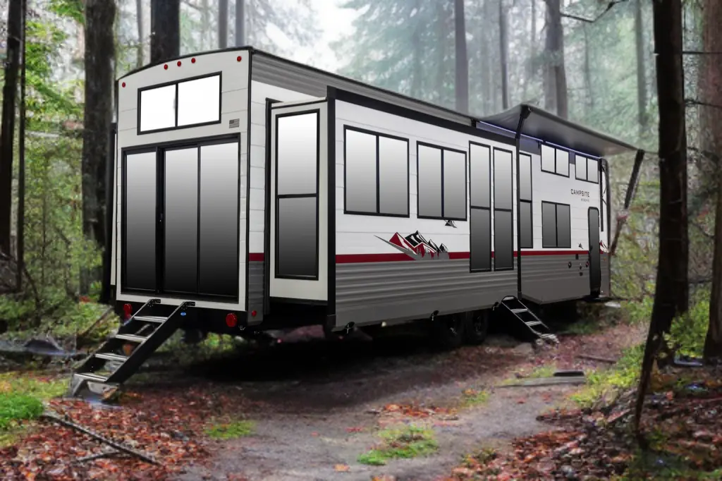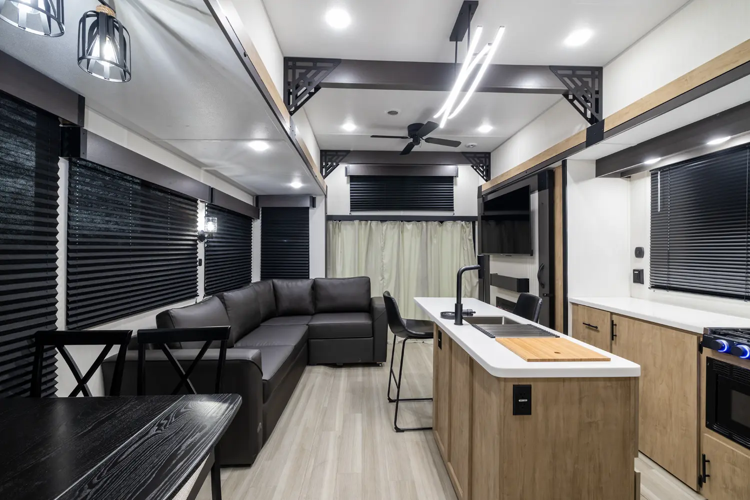 The first destination trailer in the Campsite Reserve brand is finally here! This unique model was designed with a sliding glass door and L-shaped sectional that make the living room feel truly expansive. This model is also highlighted by 2 queen beds and a king size bed in the primary suite.