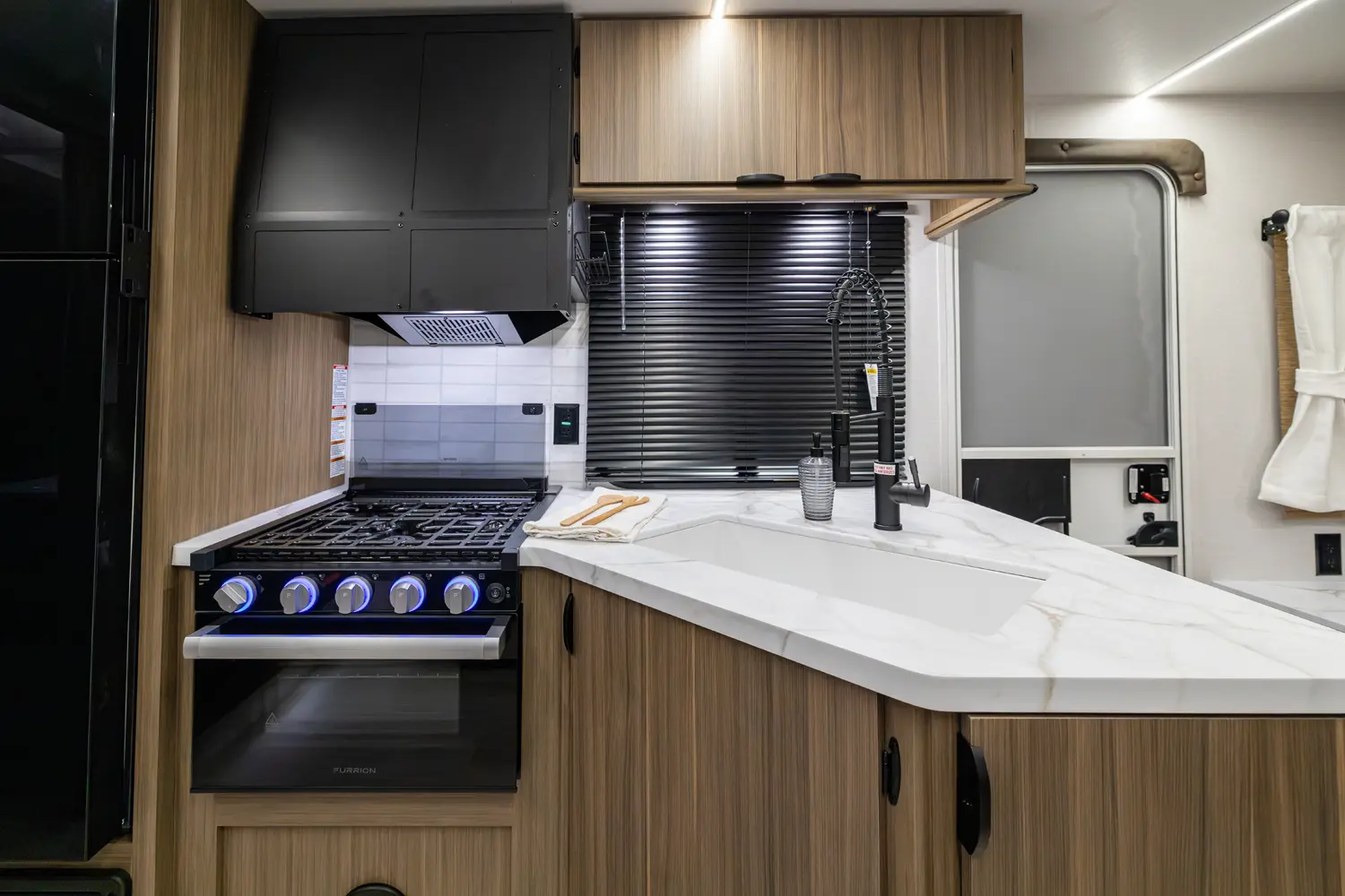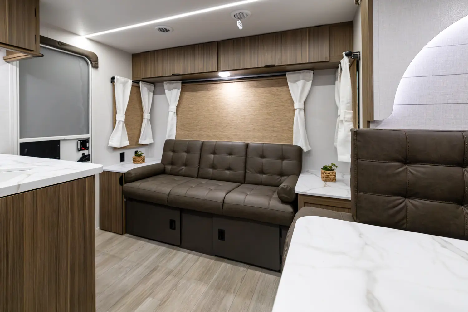 The 24RLXL is an extra-light travel trailer that comes in at 28' 11" and just over 5,000 lbs. The master bedroom features a ton of storage, including dedicated C-pap cubbies! The bathroom provides loads of storage as well, plus a walk-in shower. The kitchen is well-appointed with modern appliances and an oversized 11 CU. FT. refrigerator, fireplace, and U-dinette.