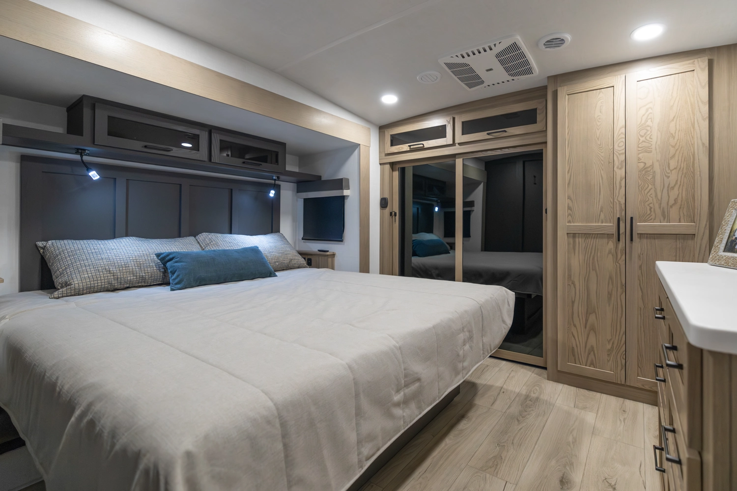 This elegant rear living unit offers a 76" hide-a-bed sofa, 60" theater seating, and a fireplace with TV for ultimate relaxation. The kitchen features an island, pantry, and ample counter space, while the dining area includes a table with chairs and bench seating. The front bedroom boasts a king bed, washer/dryer prep, dresser, and wardrobe storage. With dual awnings and pass-thru storage, it’s built for comfort and convenience.