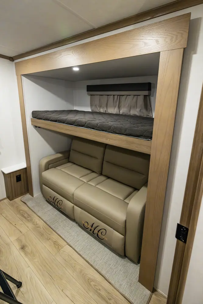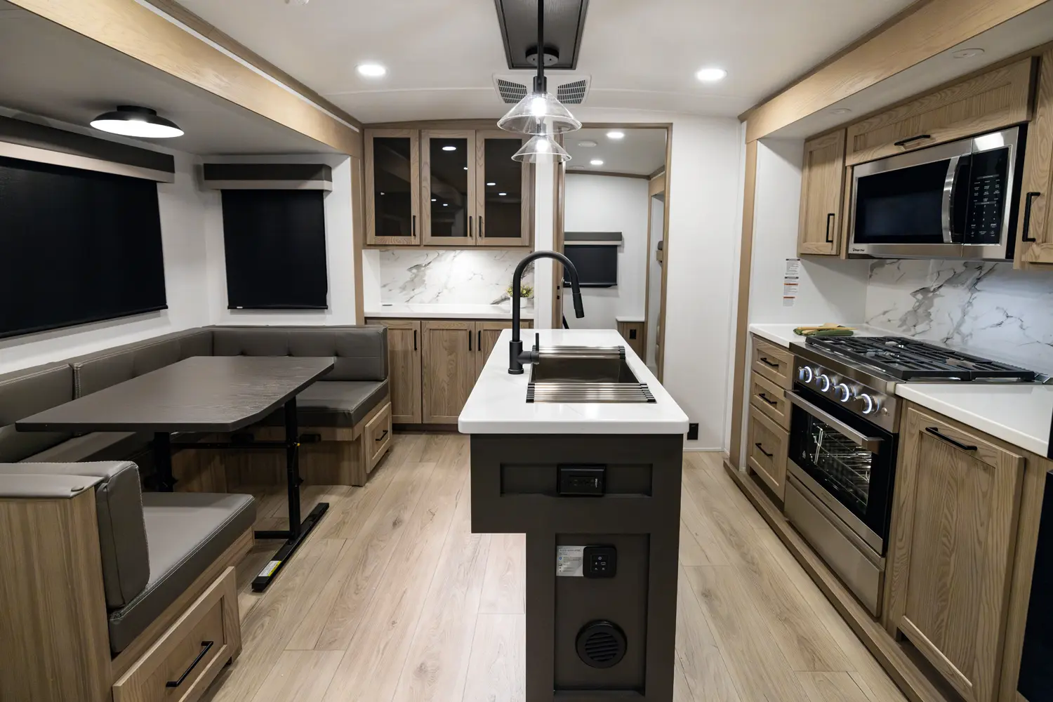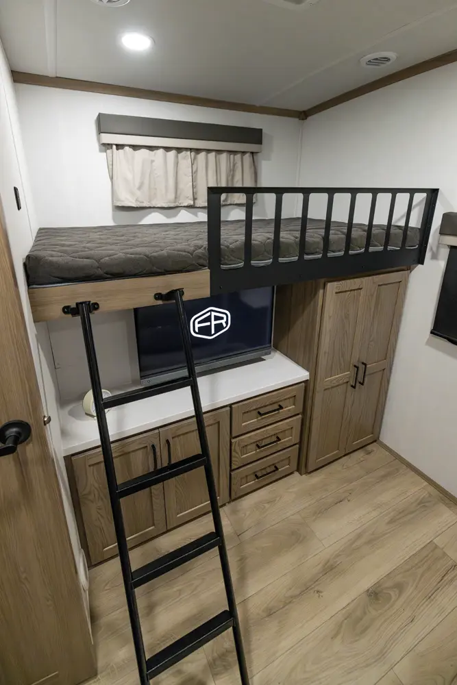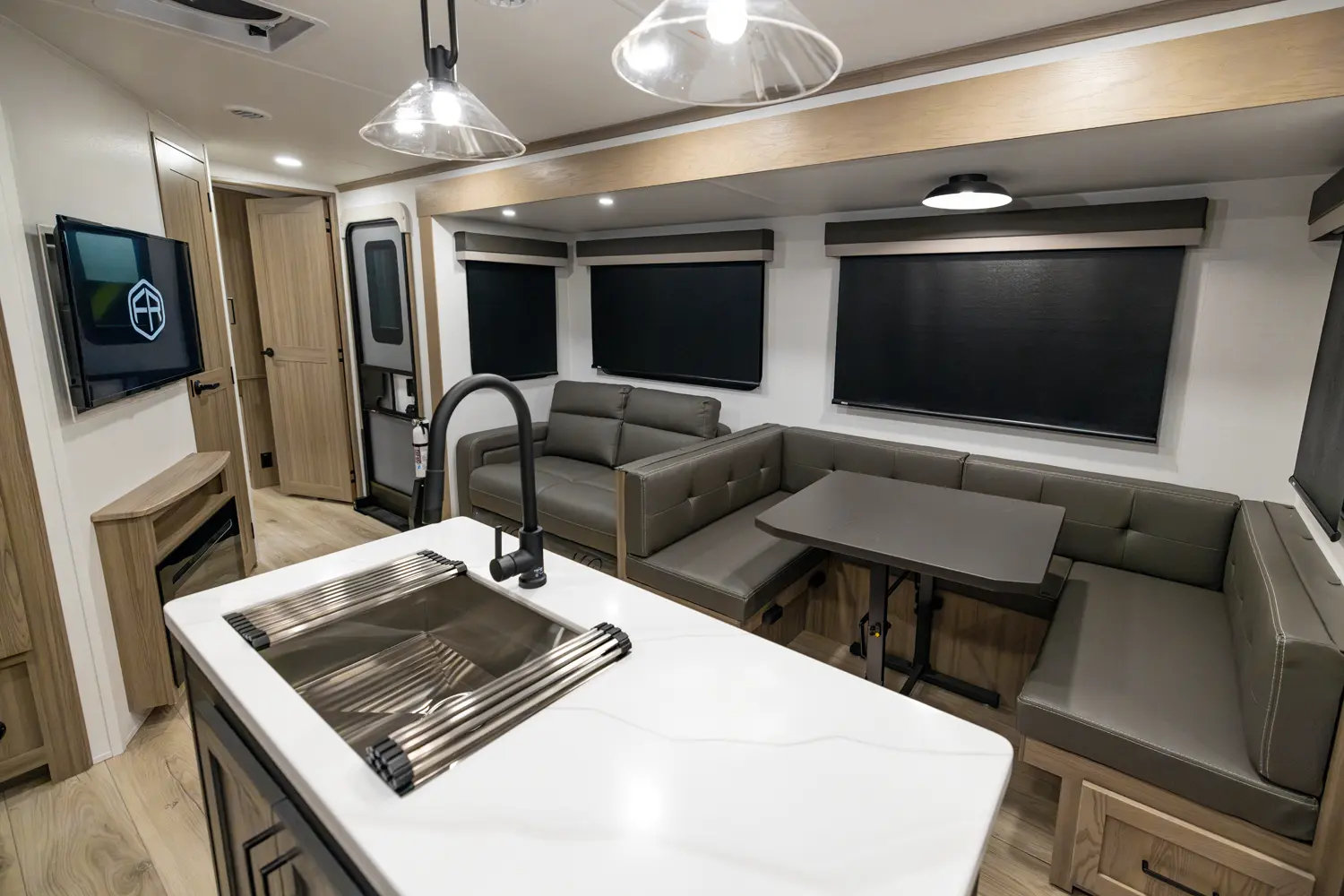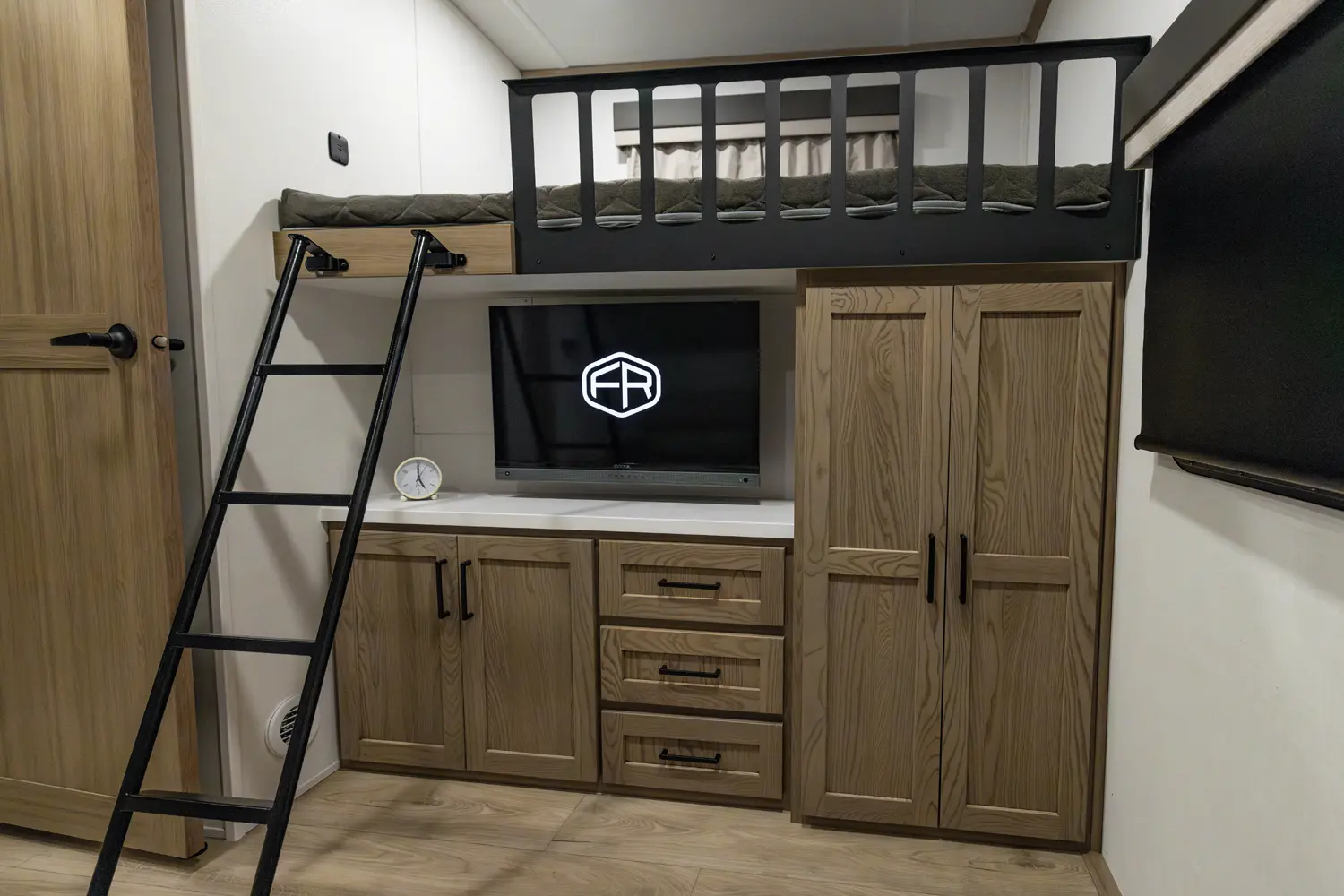 This four slide bunk model has great sleeping arrangements and a U-Dinette that can seat everyone for dinner. The outside camp kitchen has a large refrigerator and cooking stove to feed everyone you are sleeping for the trip. The bunkroom has its own entertainment and hard door for separation from the rest of the coach. The king bed option and the washer and dryer prep make this coach great on every occasion for any family.
