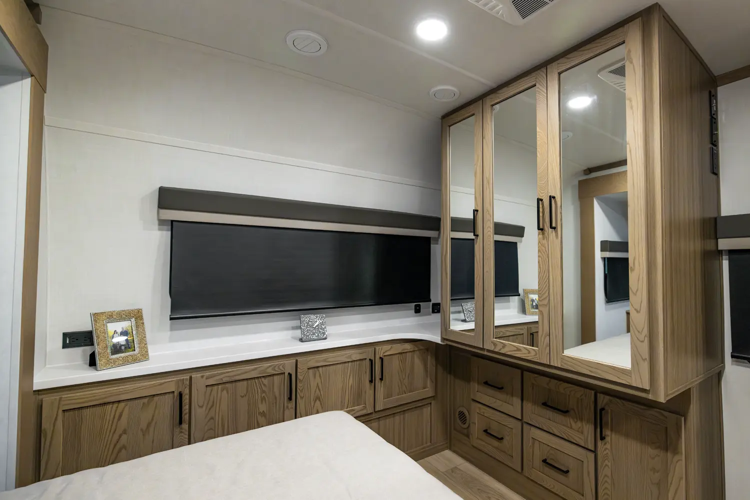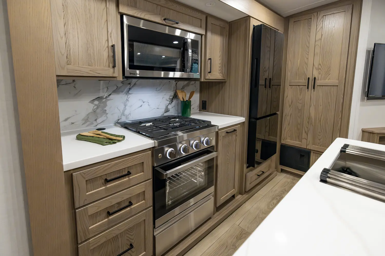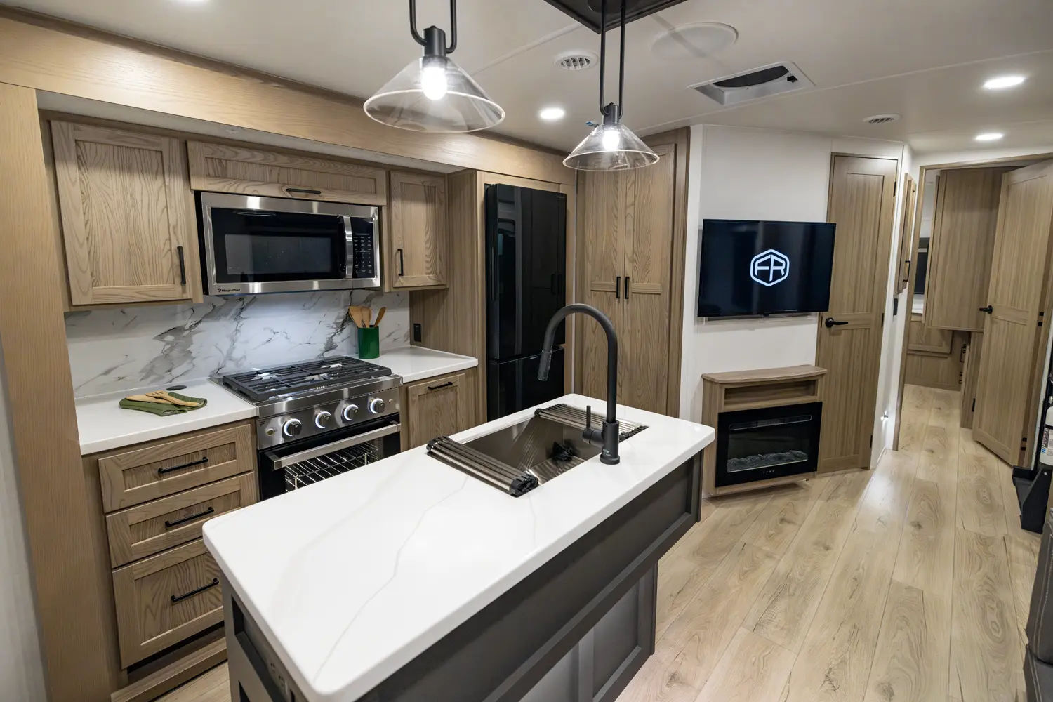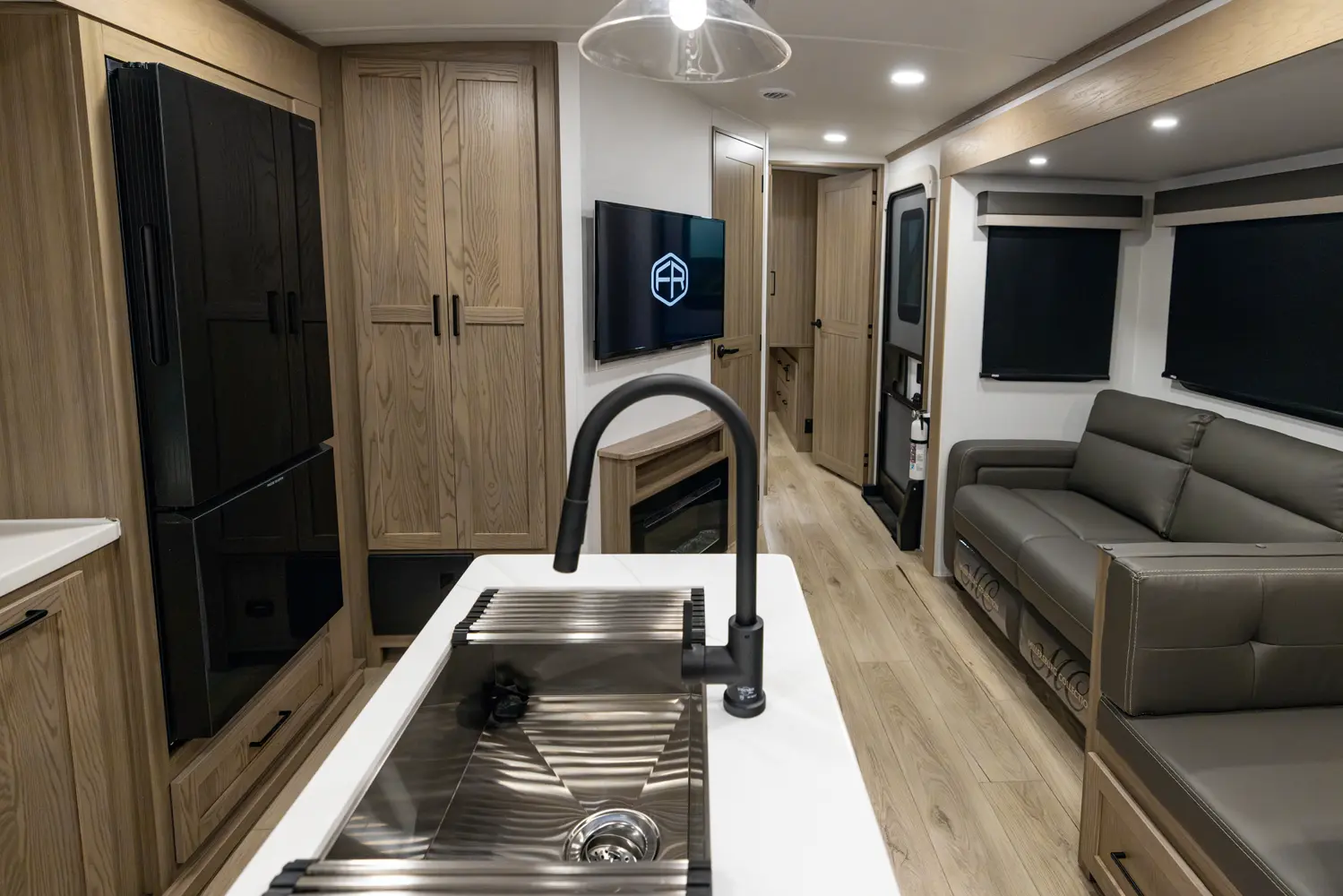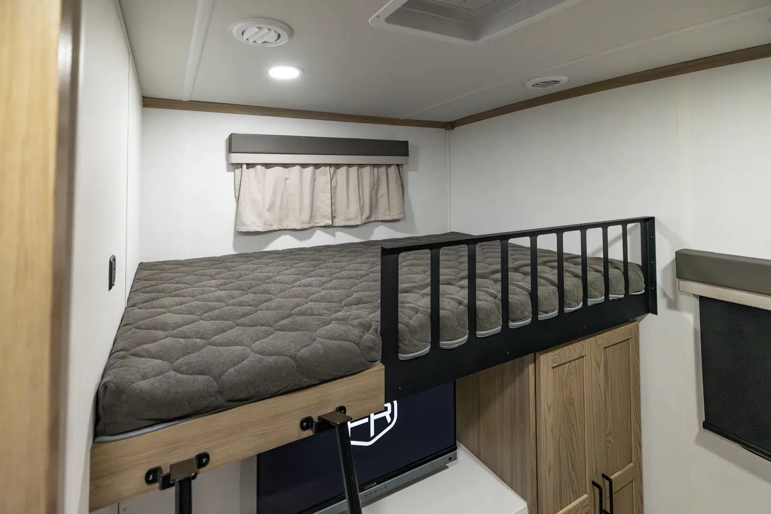 This four slide bunk model has great sleeping arrangements and a U-Dinette that can seat everyone for dinner. The outside camp kitchen has a large refrigerator and cooking stove to feed everyone you are sleeping for the trip. The bunkroom has its own entertainment and hard door for separation from the rest of the coach. The king bed option and the washer and dryer prep make this coach great on every occasion for any family.