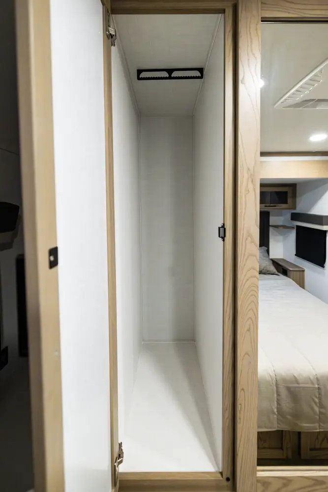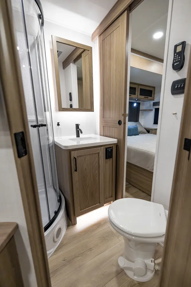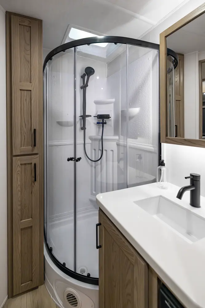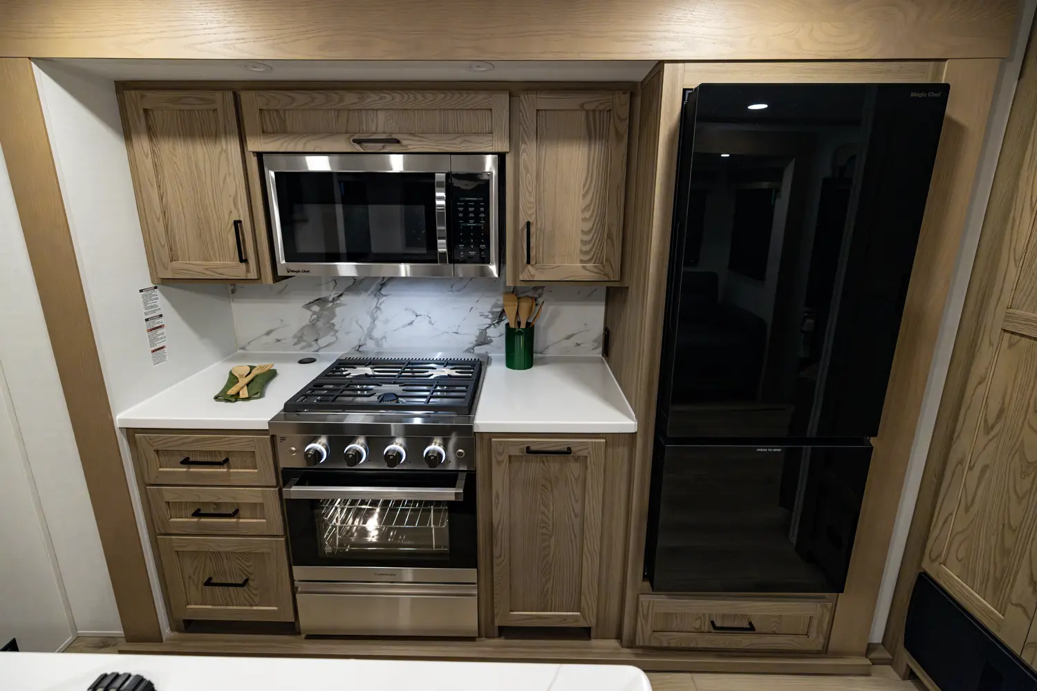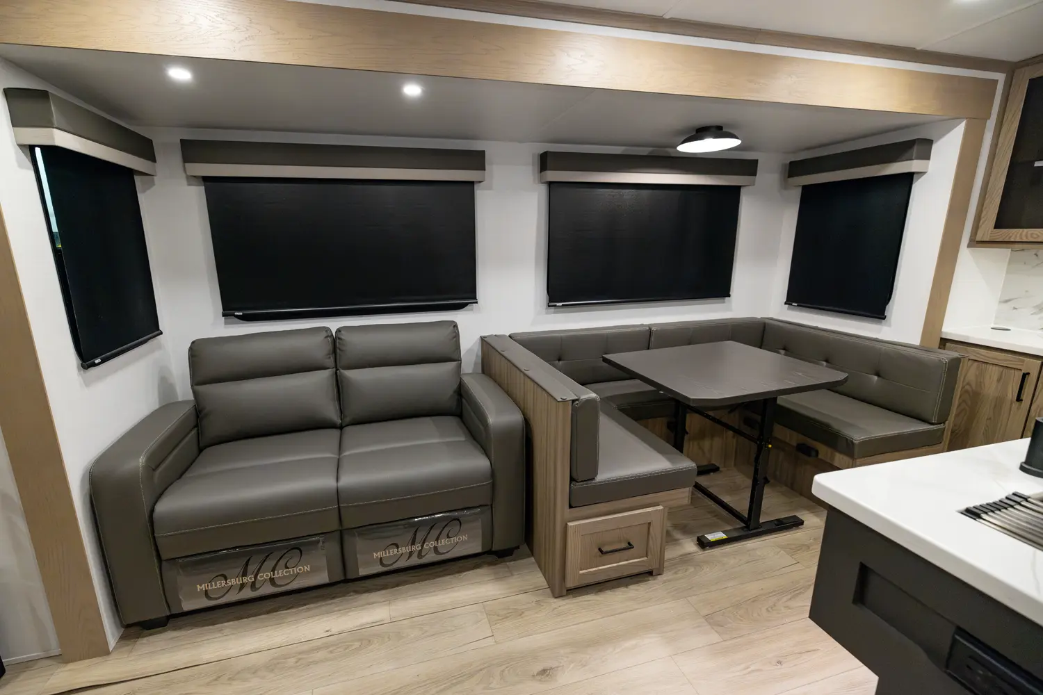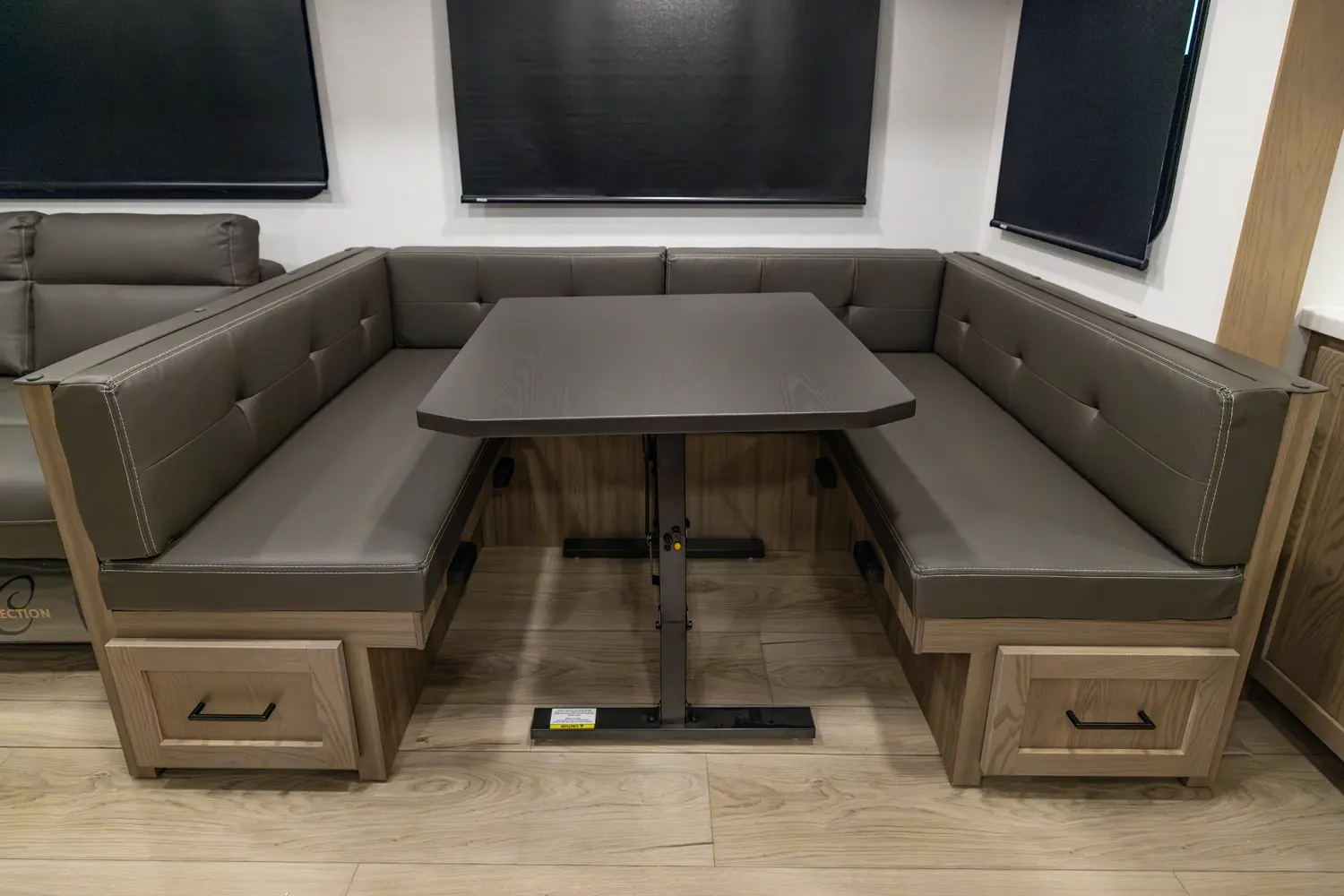This four slide bunk model has great sleeping arrangements and a U-Dinette that can seat everyone for dinner. The outside camp kitchen has a large refrigerator and cooking stove to feed everyone you are sleeping for the trip. The bunkroom has its own entertainment and hard door for separation from the rest of the coach. The king bed option and the washer and dryer prep make this coach great on every occasion for any family.