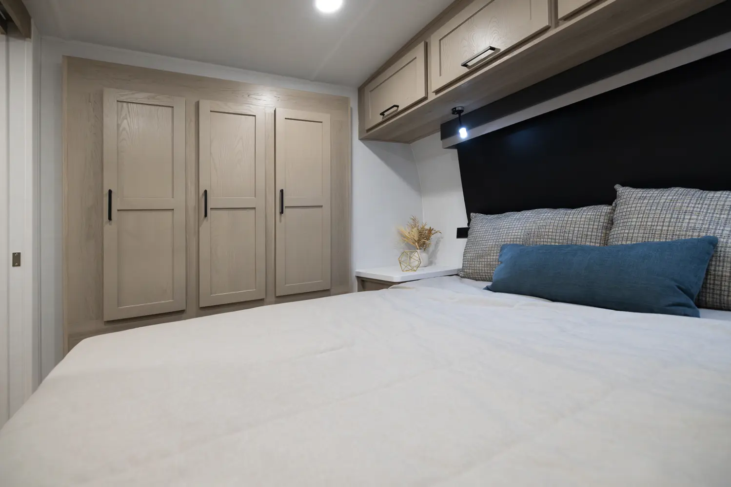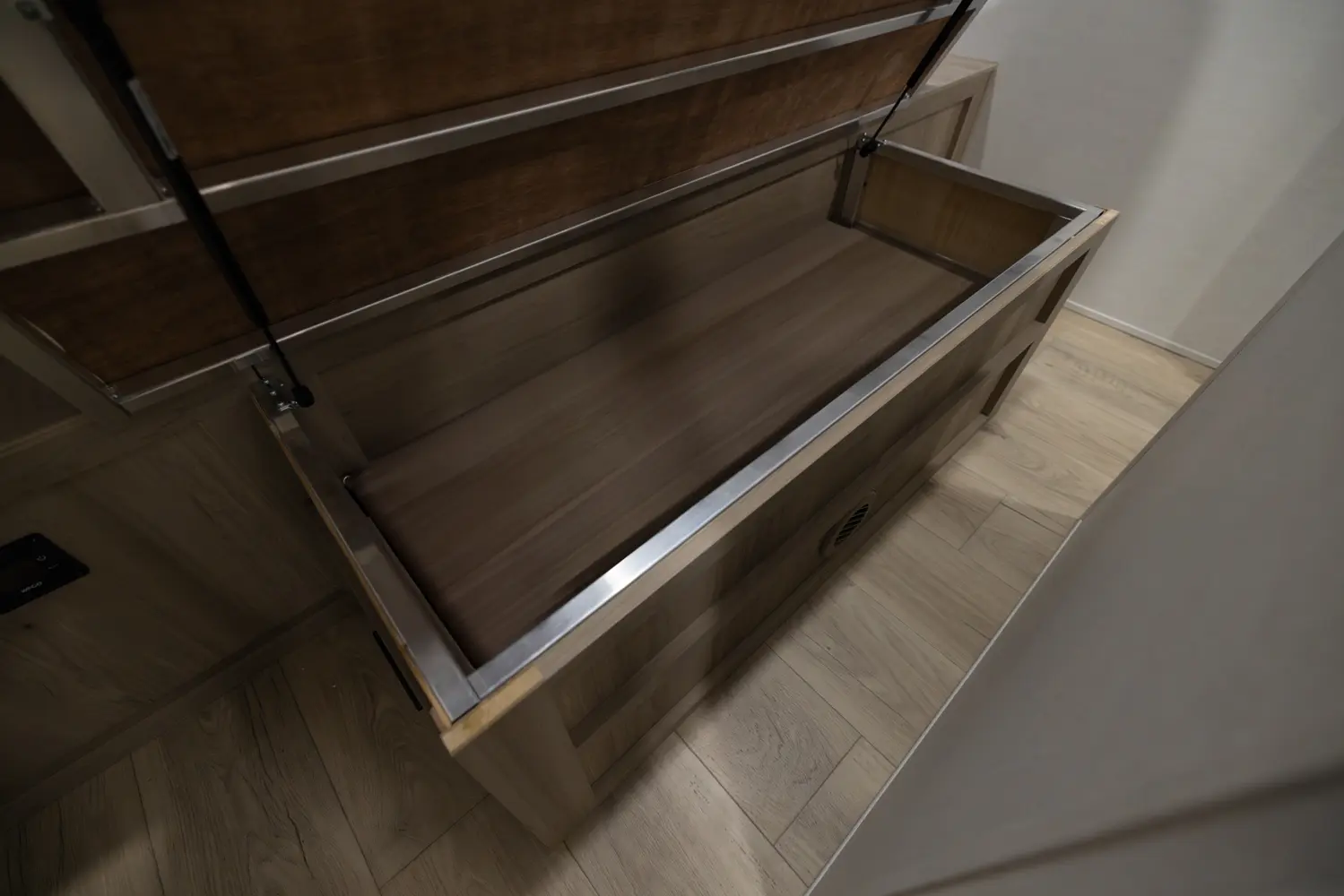 The outside kitchen on this Flagstaff Micro Lite featuring our new griddle, a refrigerator and grill makes cooking so enjoyable and flexible. No need to take the smell of cooking bacon inside. The large wardrobe slide makes packing and organization so easy. The large pantry next to the bathroom covers all your kitchen storage needs as well. The center position of the television in your entertainment spaces makes viewing from any part of the living quarters easy.