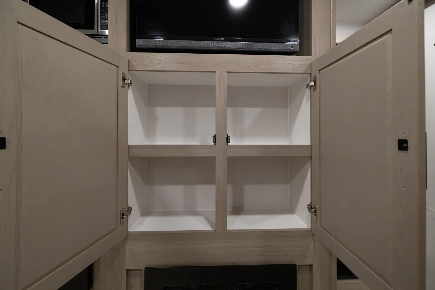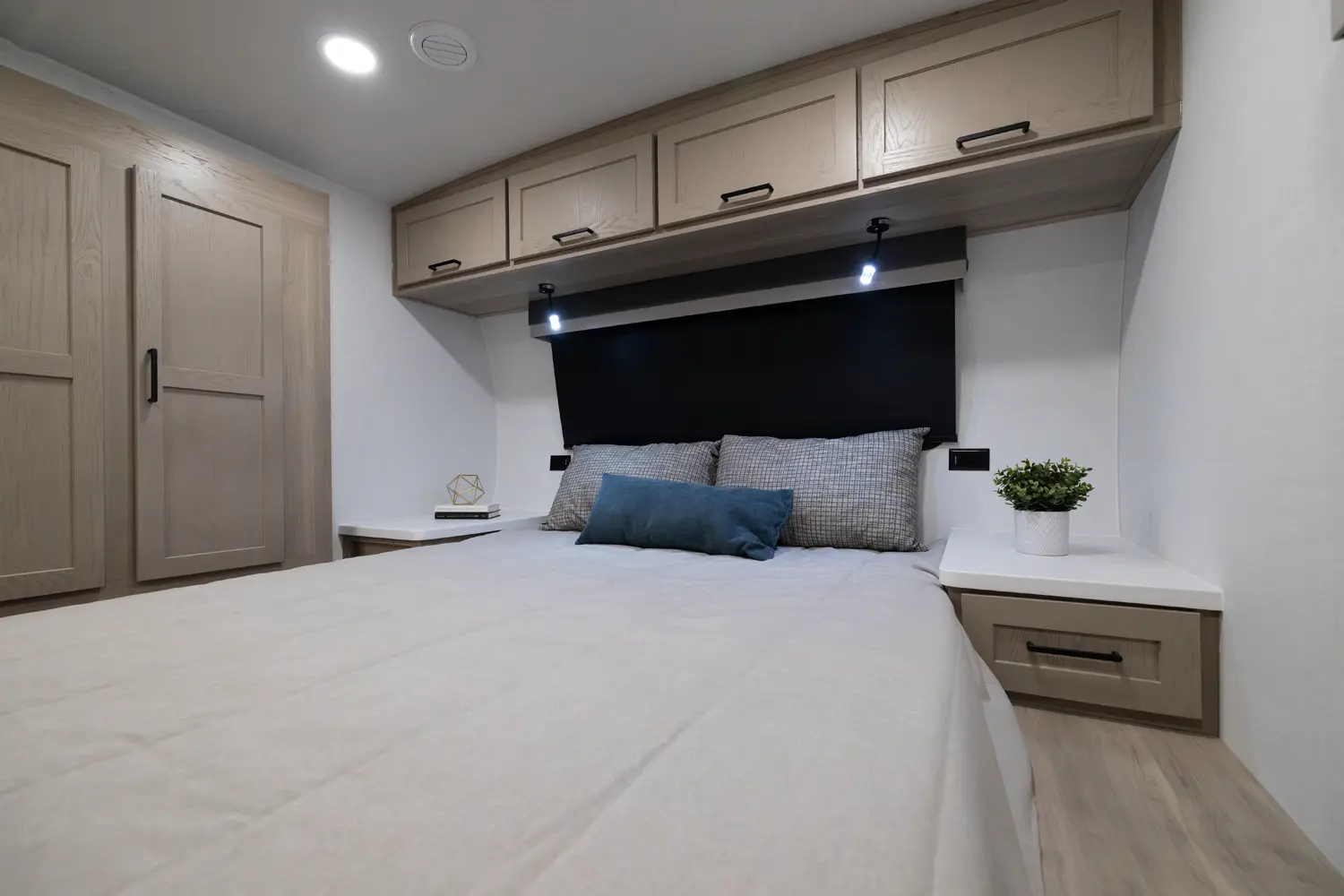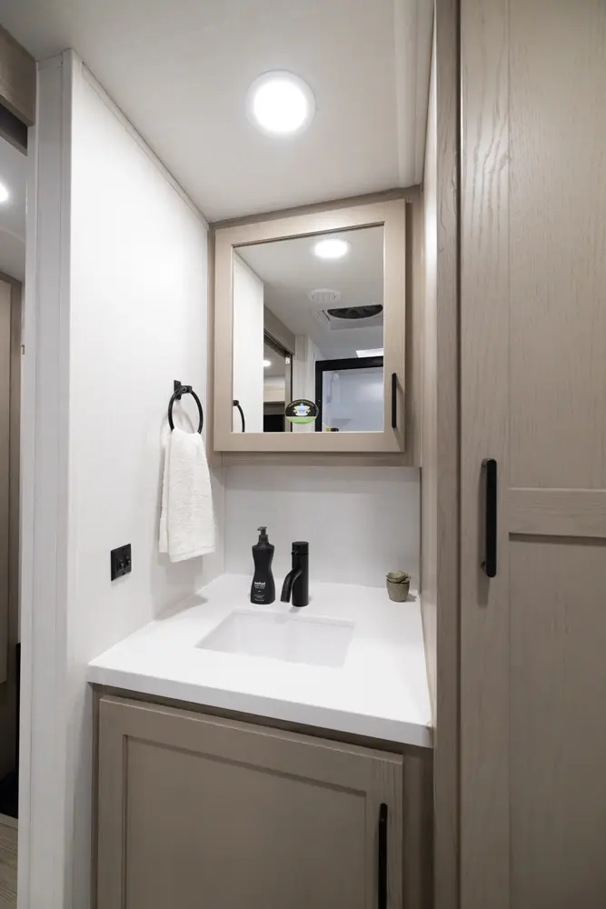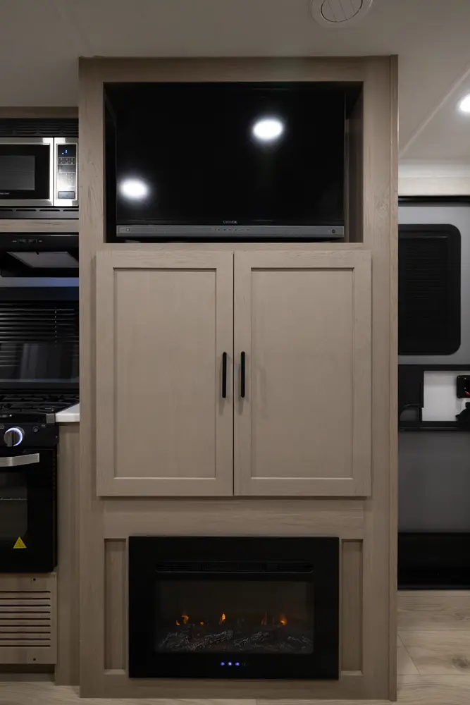 This unit is unique with its big 36" sliding doors leading to the bathroom and bedroom. These doors make moving around for a broad shouldered person easier and comfortable. The entertainment center is loaded with 32" tv, a residential-style soundbar and a fireplace space heater. Across from this lovely entertainment center is a 72" theatre seating which is perfect for reclining and watching a good movie.