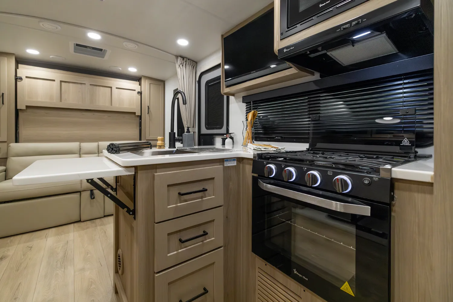 This is the perfect family trailer towing under 26' feet. The double 48" X 72" bunkhouse is awesome for sleeping the kids and even fits adults comfortably. The bottom bunk folds up for even more storage and toys will fit nicely underneath! The big 60" X 74" murphy bed folds up into a sofa for daily use. The giant 18' awning goes almost all the way across your unit while covering the outside kitchen.