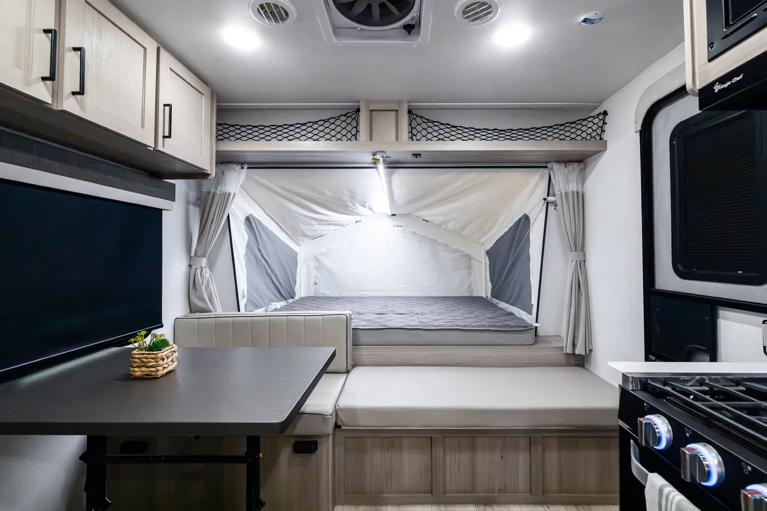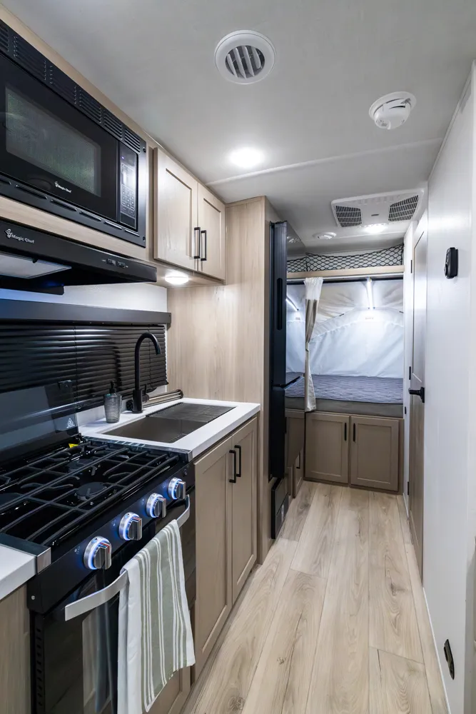 The 17E is Rockwood’s first and only single axle hybrid, making it both lighter and easier to tow than traditional hybrids without sacrificing features. Its smart design delivers comfortable sleeping, dining, and living spaces in a compact footprint. This floorplan is perfect for adventurers who want big camping experiences with minimal towing hassle.