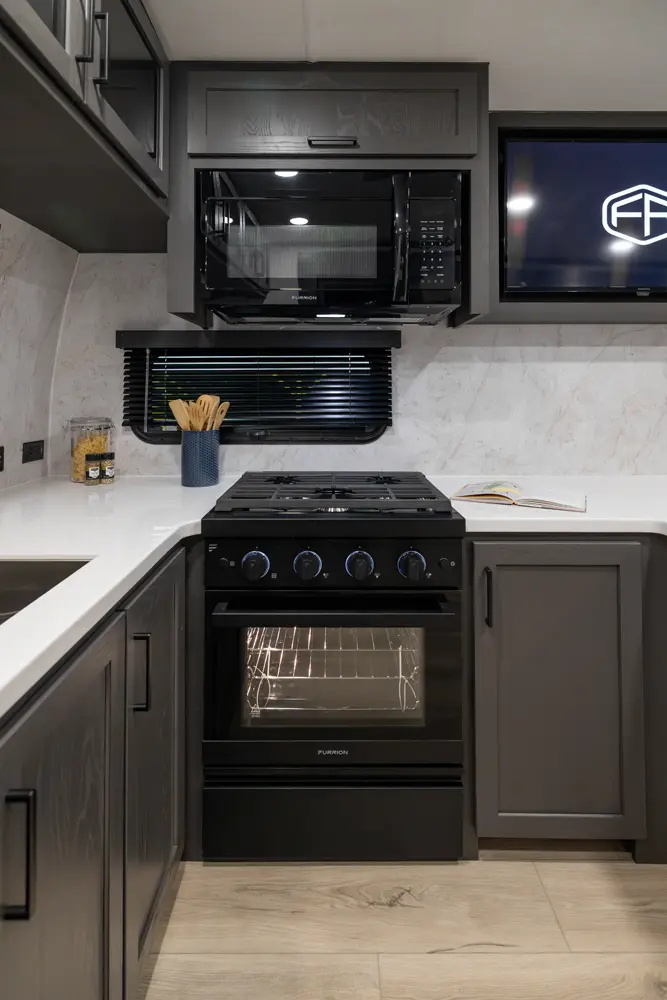 The two person bar top seating and a large window in the front give this coach an open feel with the ability to see your campsite. The theater seating is directly across the entertainment center for easy viewing and comfort. The bedroom in this unit is the game changer with a king bed in a slide out, a large wardrobe and dresser in the middle of this bedroom is perfect. A bathroom with a double sink vanity and 48” x 30” shower with a seat make this bathroom truly a master.