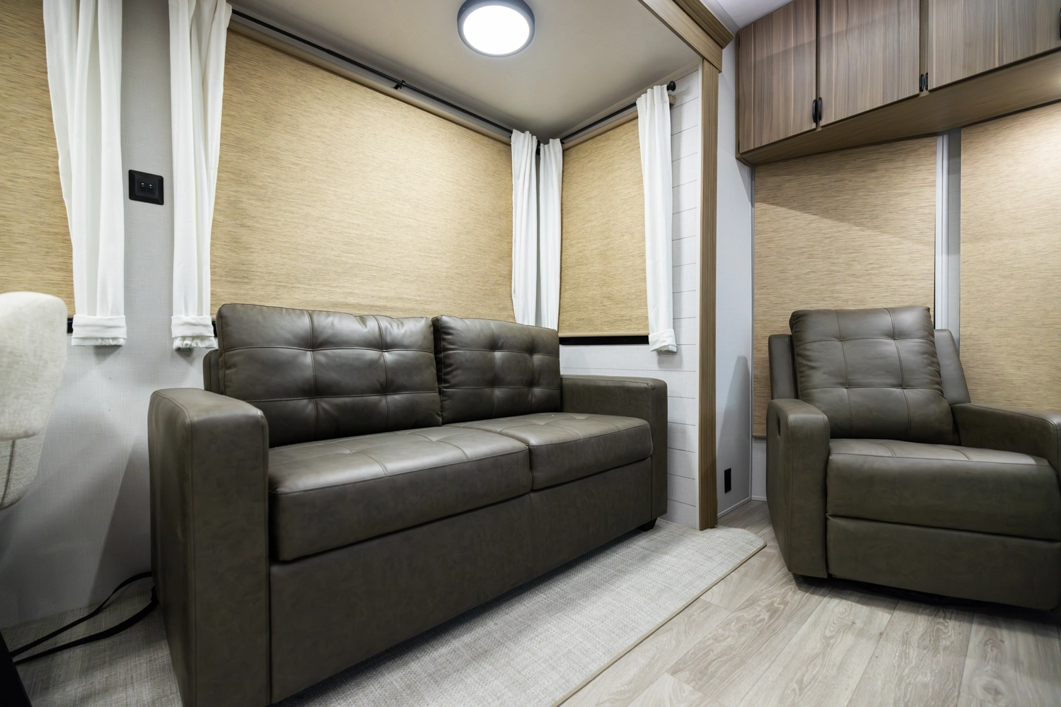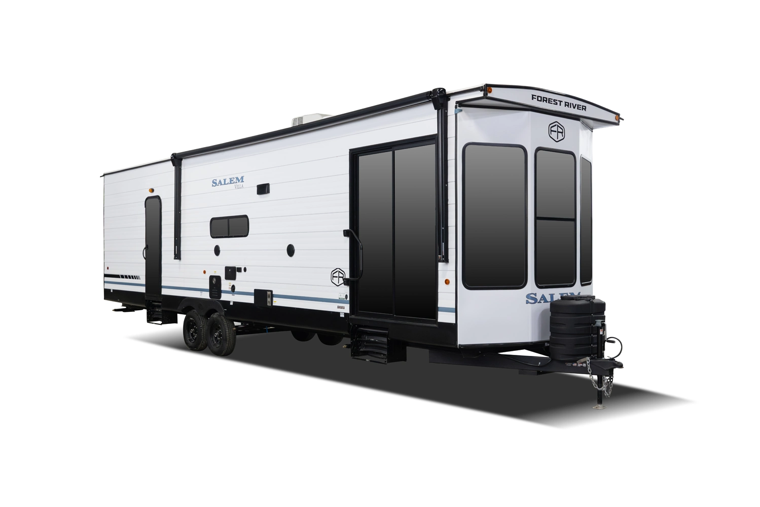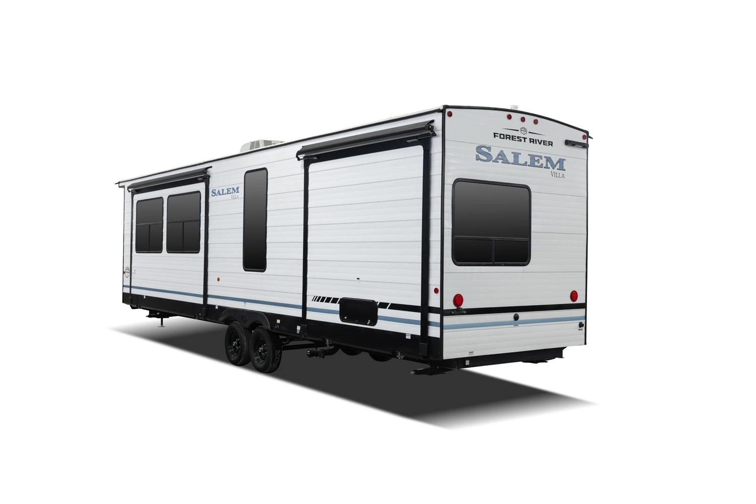 The Salem Villa 353FLB is the perfect destination trailer for making memories! The rear king bedroom provides plenty of space to stretch out, plus loads of storage space, while the adjacent bathroom gives you a linen closet and walk-in shower with a built-in seat. The large kitchen area includes a stove top plus oven, a residential refrigerator, and farmhouse sink. The living area has both theater seating and sofa with panoramic windows for great campsite views.