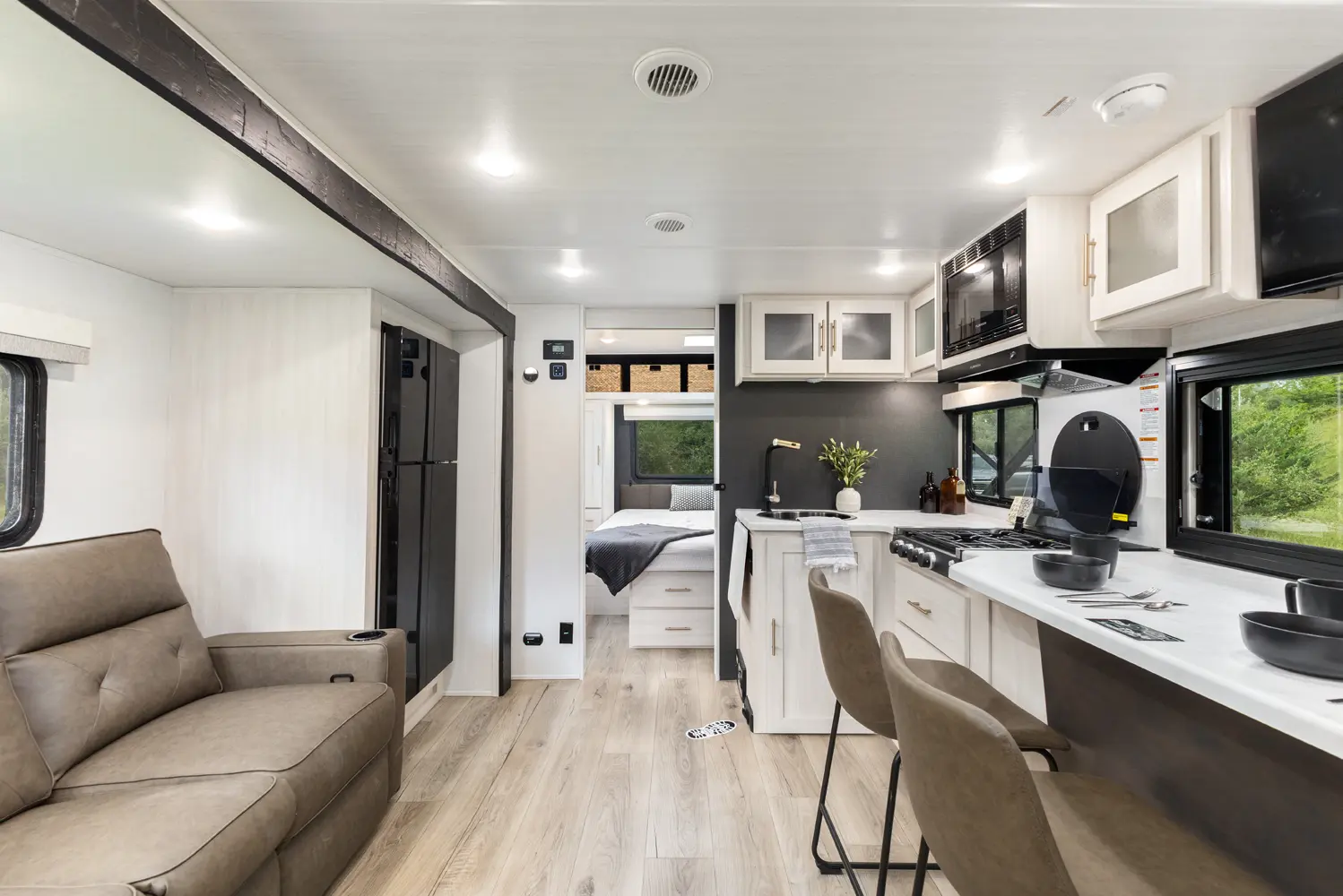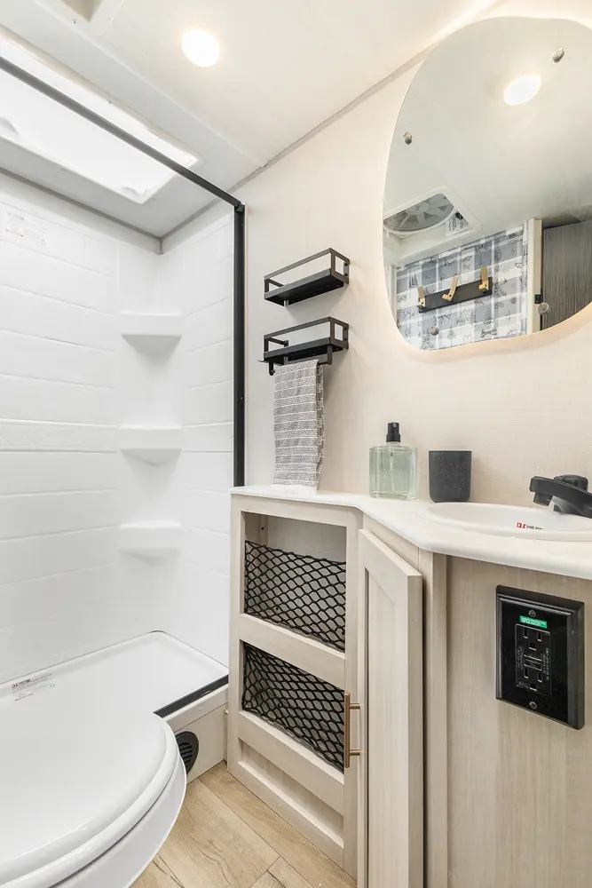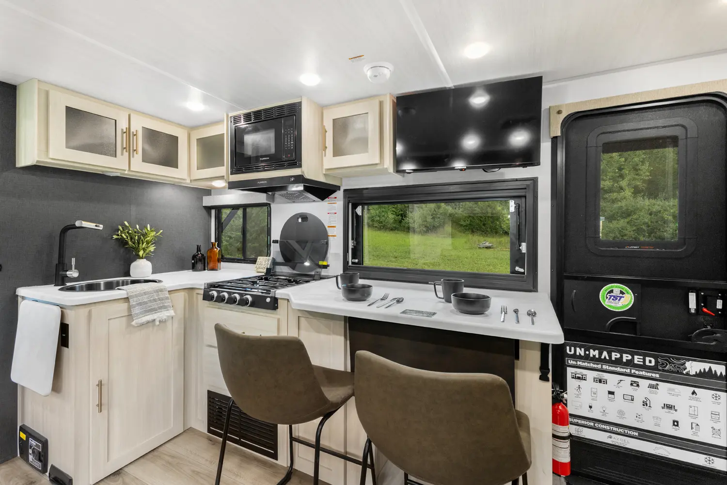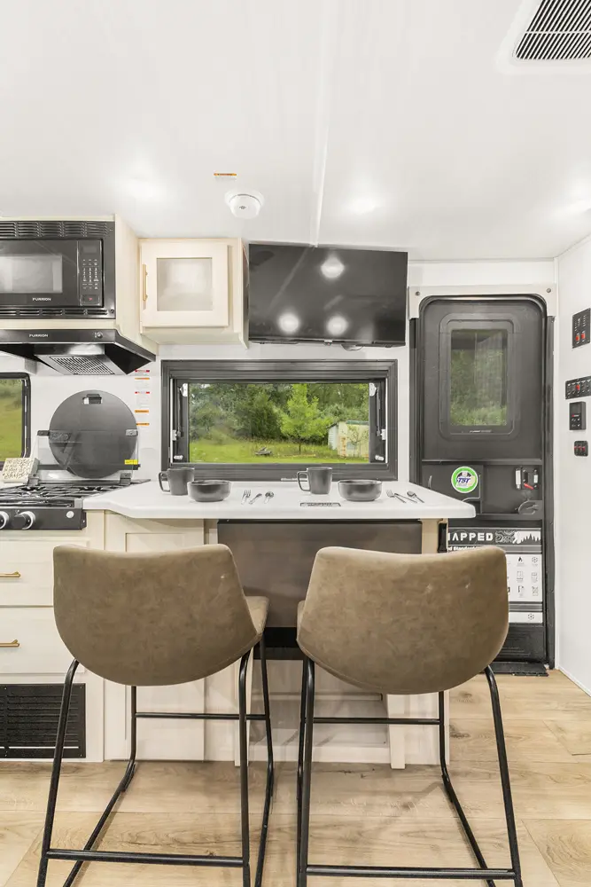 The Un•Mapped 26BH features a rear bunkhouse with double-over-double bunks, accommodating up to four sleepers. The kitchen is equipped with a 12V black glass refrigerator and an air fryer microwave. The Bar2Table pull-out dinette and TrailGate outdoor bar enhance dining flexibility and outdoor entertaining. Inside, enjoy a king bed, 15K A/C, and a tankless on-demand water heater. Exterior amenities include a 21' powered awning and a hot & cold spray port, perfect for compact adventures.